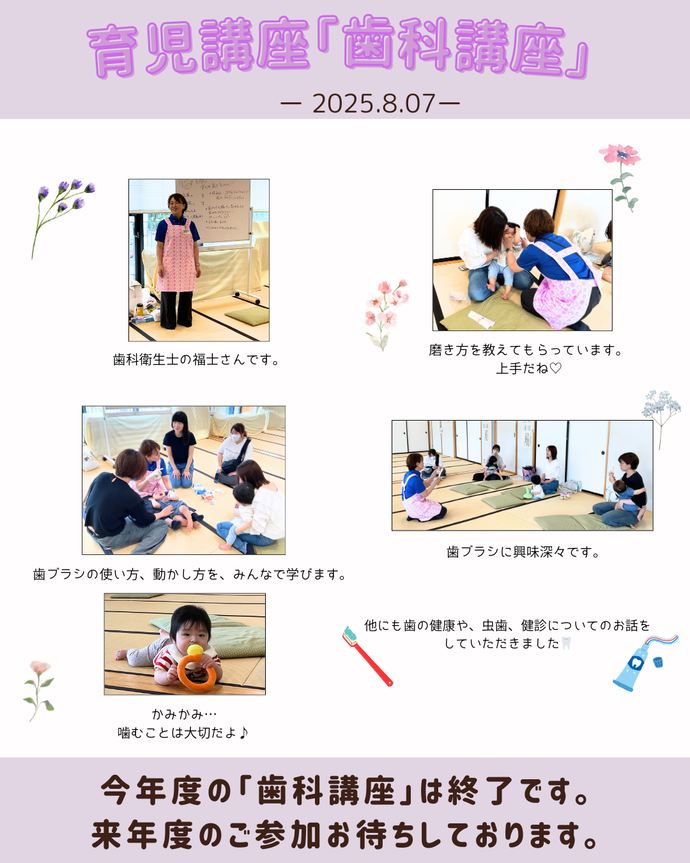 ベビーマッサージ、離乳食講座、歯科講座などを開催しています。