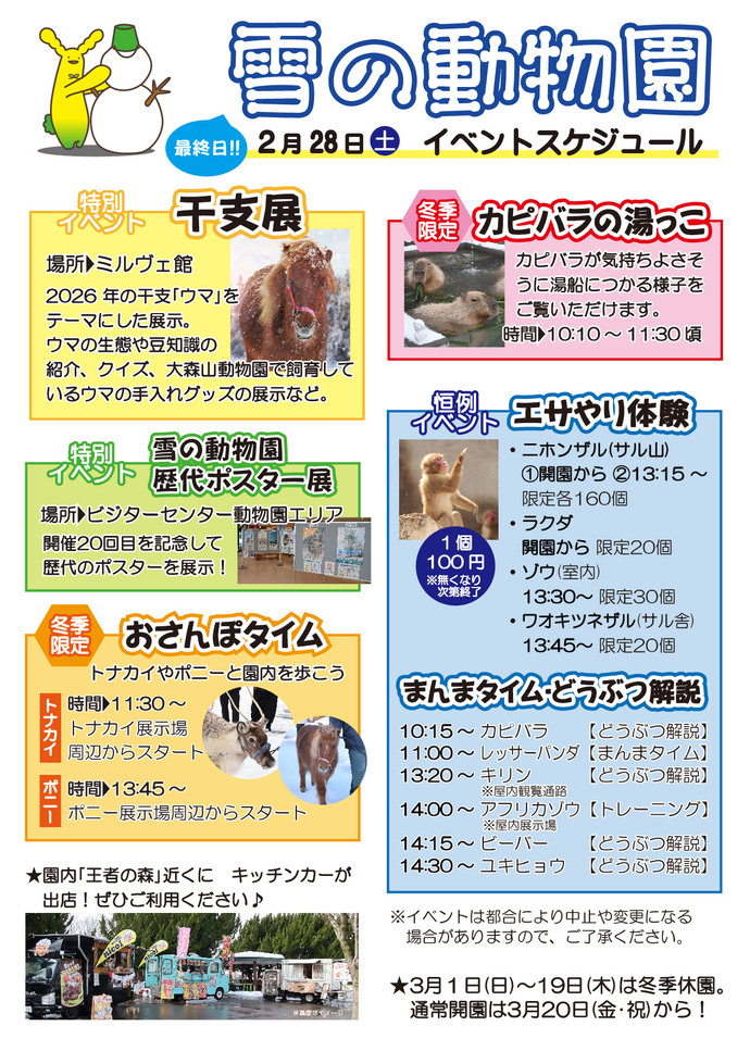注:園内の軽食「森のこまち」は、雪の動物園期間は営業しませんのでご了承ください。