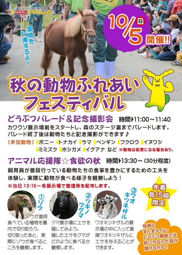 園内を動物たちが行進する「どうぶつパレード」や、動物たちの食事を豊かにするための工夫を体験する「アニマル応援隊☆食欲の秋」を行います。